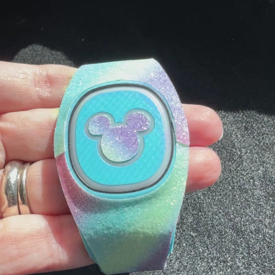 Sweet, shimmery, and totally unique — our Cotton Candy Gradient Super Sparkle Magic Band + Decal Skin Bow ONLY is a dreamy blend of pastel pinks, purples, and blues with a no-flake glitter finish that shines like spun sugar! Each wrap is one-of-a-kind, featuring its own gradient pattern that ensures no two bands are ever exactly the same.